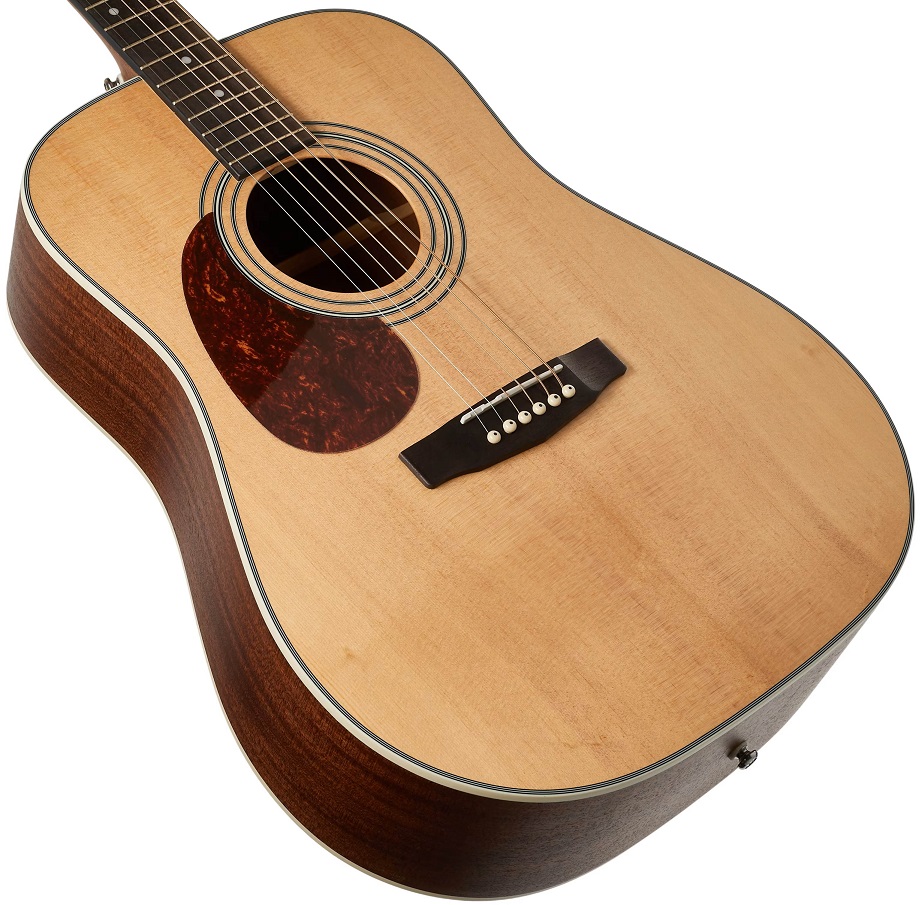 Покрытие Open Pore позволяет древесине “дышать”, что улучшает резонанс. Звук становится более открытым и естественным. Натуральная текстура дерева добавляет эстетики. Фирменный бридж Cort с вогнутой поверхностью улучшает сустейн. Также он уменьшает натяжение струн. Это делает игру более комфортной. Продуманные детали для лучшего звучания и удобства.