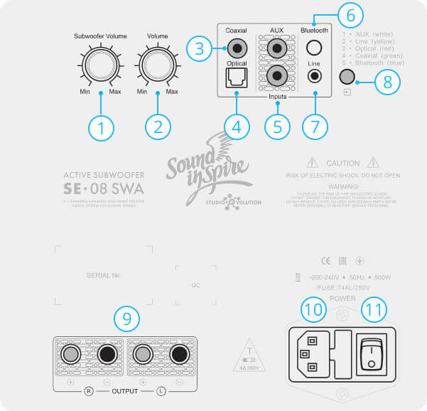 Аудиосистему можно подключить через Bluetooth® или через один из 4 аудиоинтерфейсов: Coaxial (Цирфровый), Optical (Цифровый), 3.5 mm Mini-jack (Аналоговый), RCA (Аналоговый).