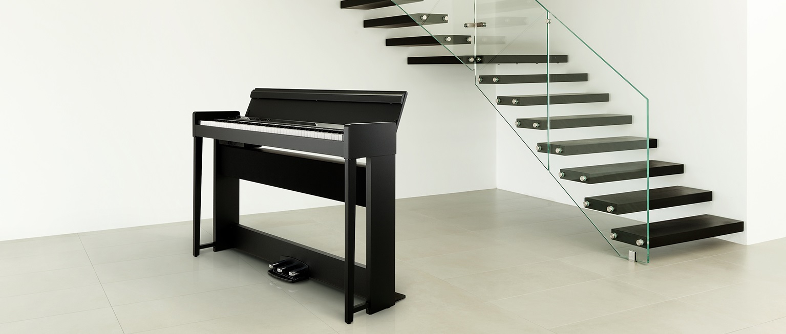 KORG C1 Air пропонує виняткове поєднання витонченого зовнішнього вигляду й передових технологій. Корпус глибиною лише 26 см легко розмістити навіть у невеликих кімнатах, а новий колір Black Wood Stain підкреслює розкішну текстуру деревини. Механізм плавного опускання кришки піклується про безпеку та довговічність інструмента.
