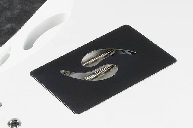 Пластина з порожниною тремоло утримується на місці за допомогою магніту, що дозволяє швидко знімати та встановлювати заново її при заміні струн або налаштуванні системи тремоло.