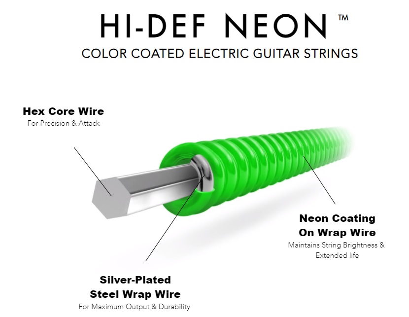 Струни для електрогітари HI-DEF NEON™ з покриттям доступні в широкому спектрі люмінесцентних кольорів,