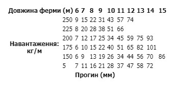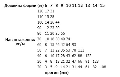 Таблиця концентрованого навантаження на середині ферми: