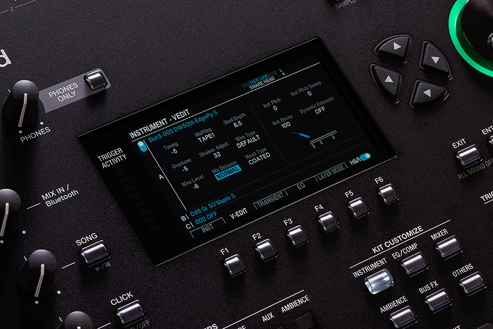 Модуль V71 оснащений 4.3-дюймовим кольоровим LCD-дисплеєм і має зручну панель керування з фейдерами для кожного елементу набору. Вбудовані Pad EQ, Pad Compressor і Overhead Mic Simulator дозволяють точно формувати мікс під будь-які умови — від студійного запису до живої сцени. Є функція імпорту користувацьких семплів, підтримка програмного редактора V71 Editor, а також підключення USB-C Audio/MIDI (до 32 каналів) для роботи з цифровими аудіостанціями.